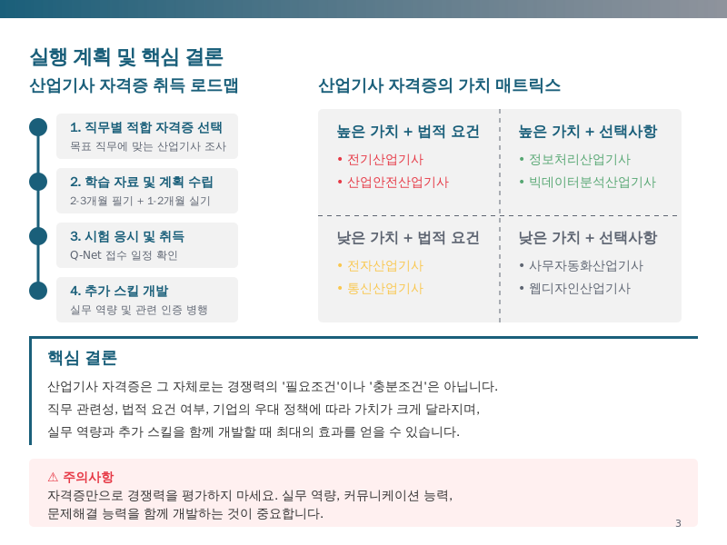 ⚠️ 주의: 산업기사 자격증만으로는 실무 능력을 완벽히 증명할 수 없습니다. 실제 업무 경험과 프로젝트 수행 능력, 그리고 관련 교육 이수 등을 함께 어필하는 것이 중요합니다.