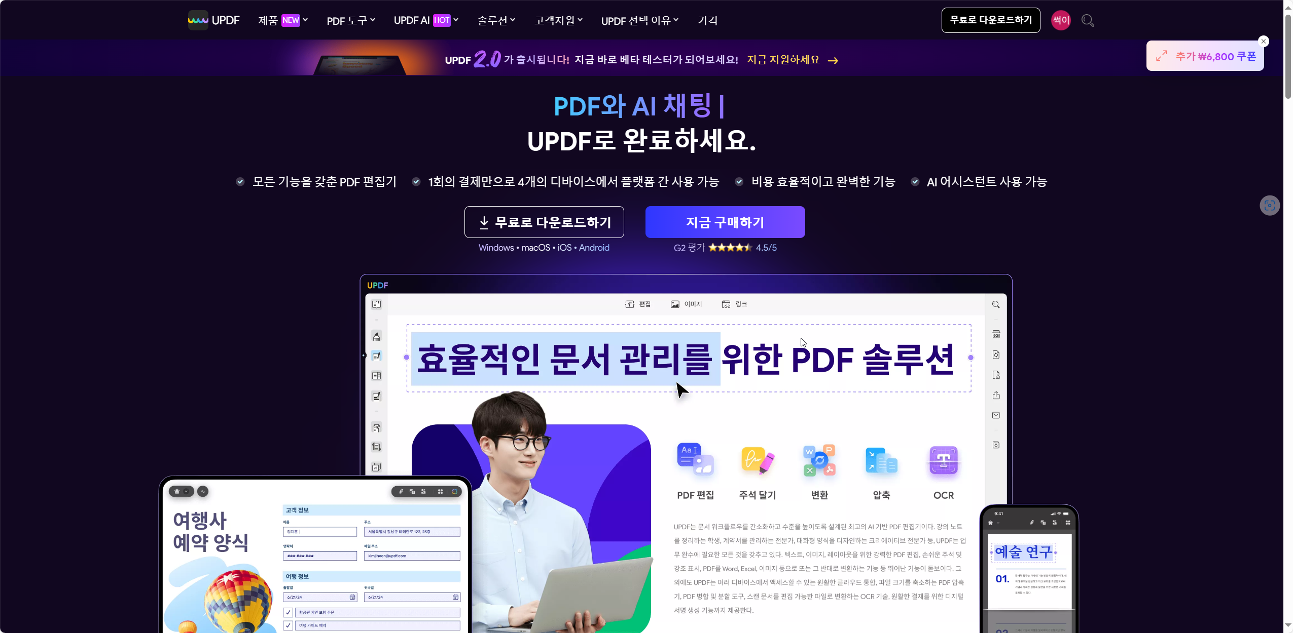 UPDF는 Windows, Mac, iOS, Android 등 다양한 플랫폼에서 사용 가능하며, 무료 체험판과 유료 버전을 모두 제공합니다. 한국어를 포함한 다양한 언어를 지원하여 전 세계 사용자가 편리하게 사용할 수 있어요!